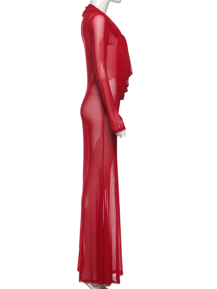 Weird Puss Sexy Thin Mesh Dress Women Deep Swing Collar Ruched Elegant Birthday Prom Party Clubwear Stretch Skinny Maxi Bodycon