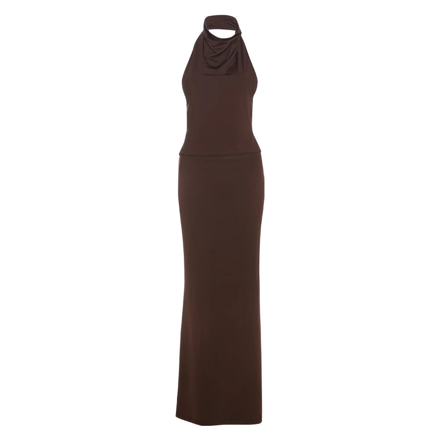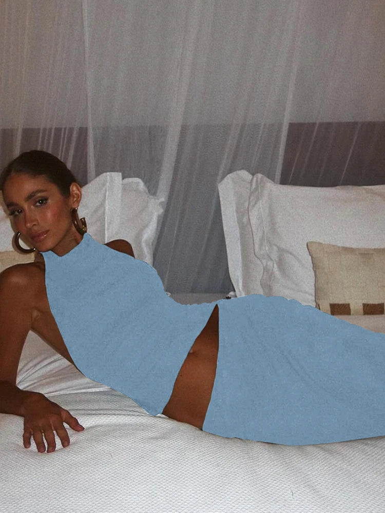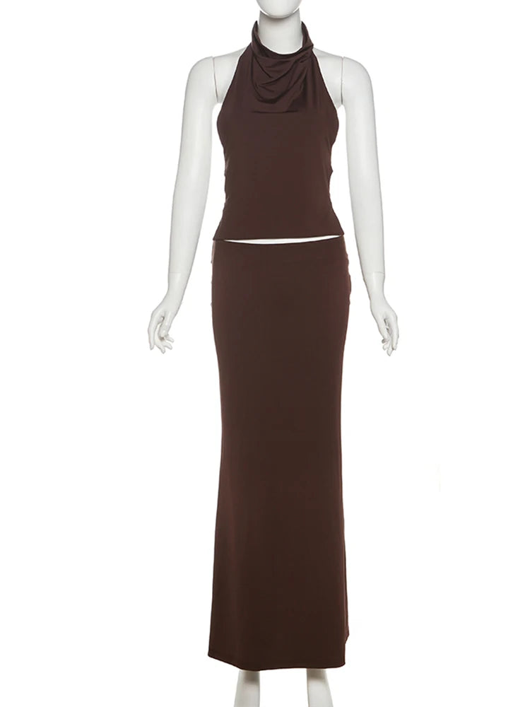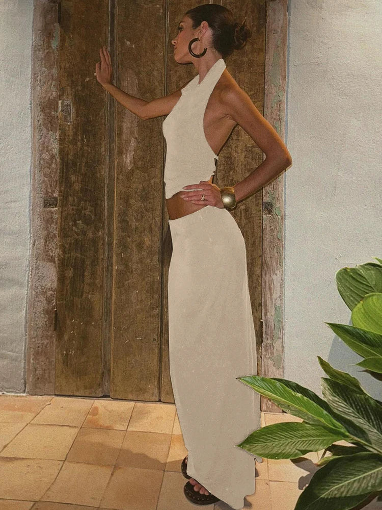 Weird Puss Simple Hollow 2 Piece Set Women Summer Halter Swing Collar Backless Crop Tops+Long Skirts Vacation Matching Outfits