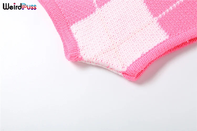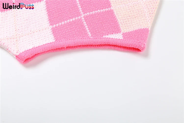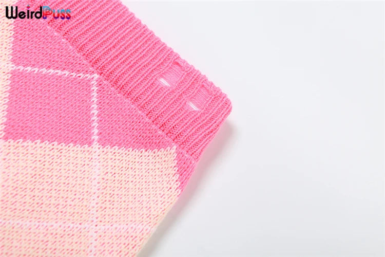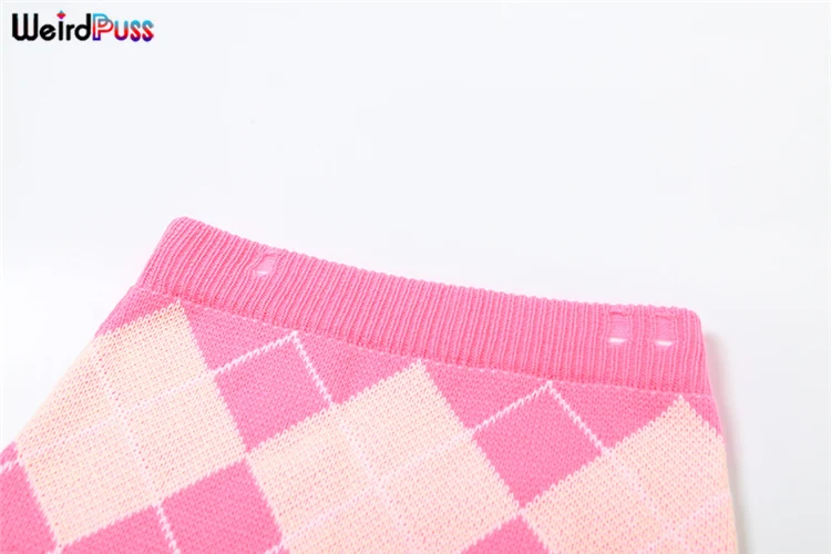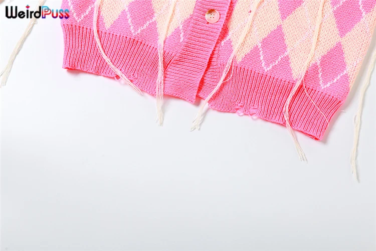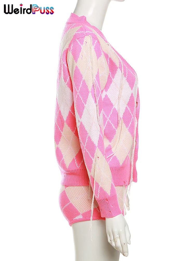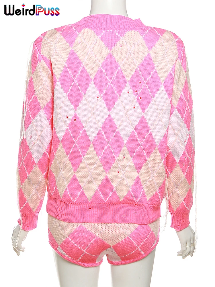 Weird Puss Sweater Women 2 Piece Set Hipster Tassel Plaid Cardigan Tops+Mini Shorts Stretch Autumn Trend Matching Street Outfits