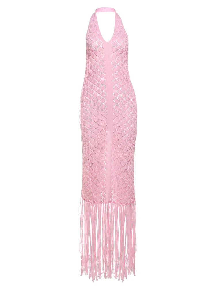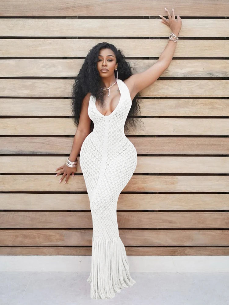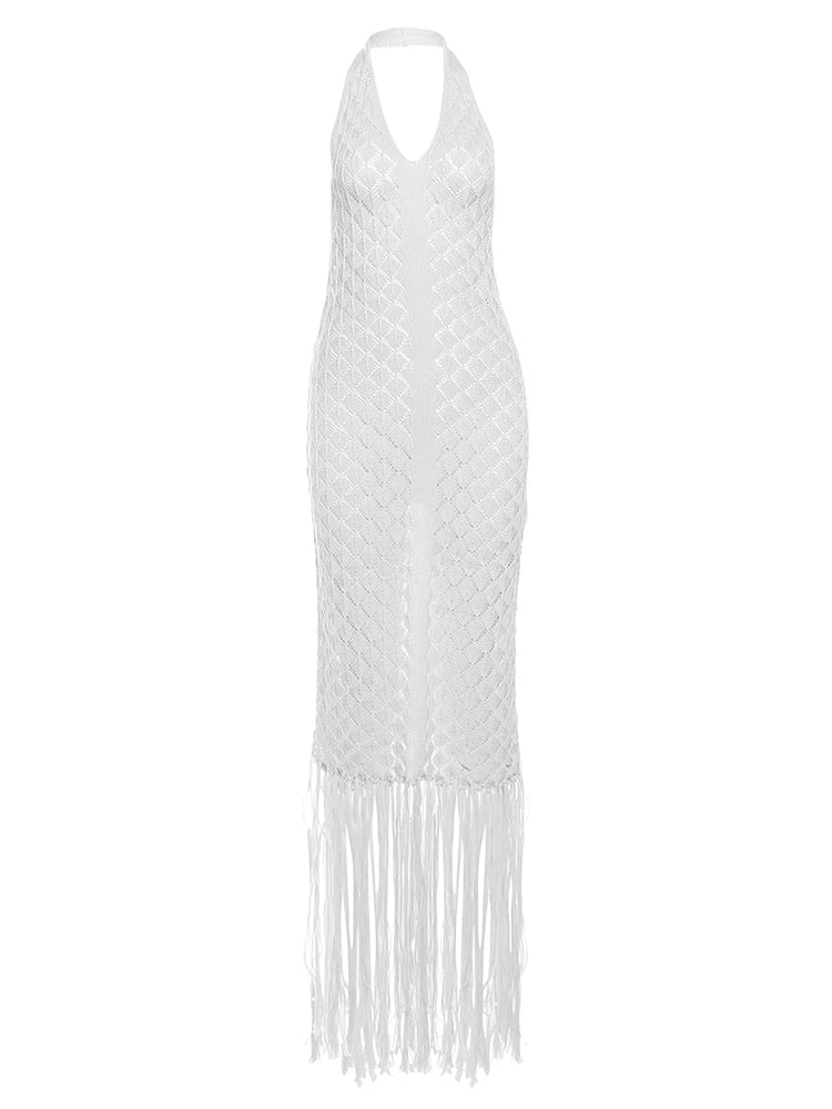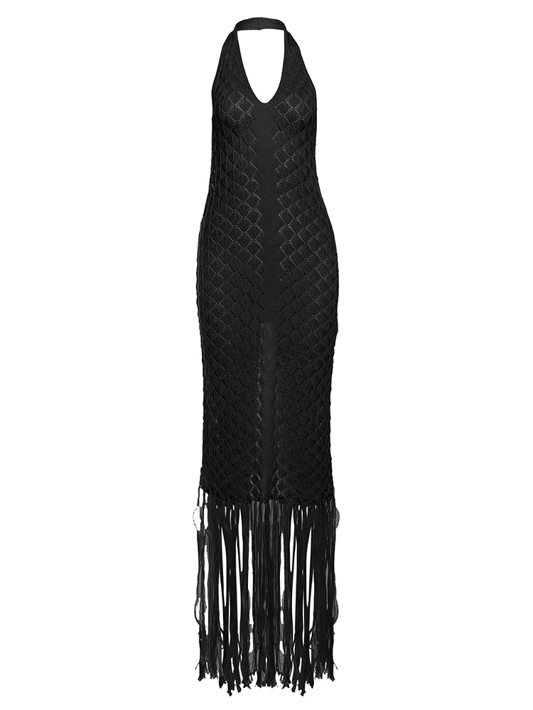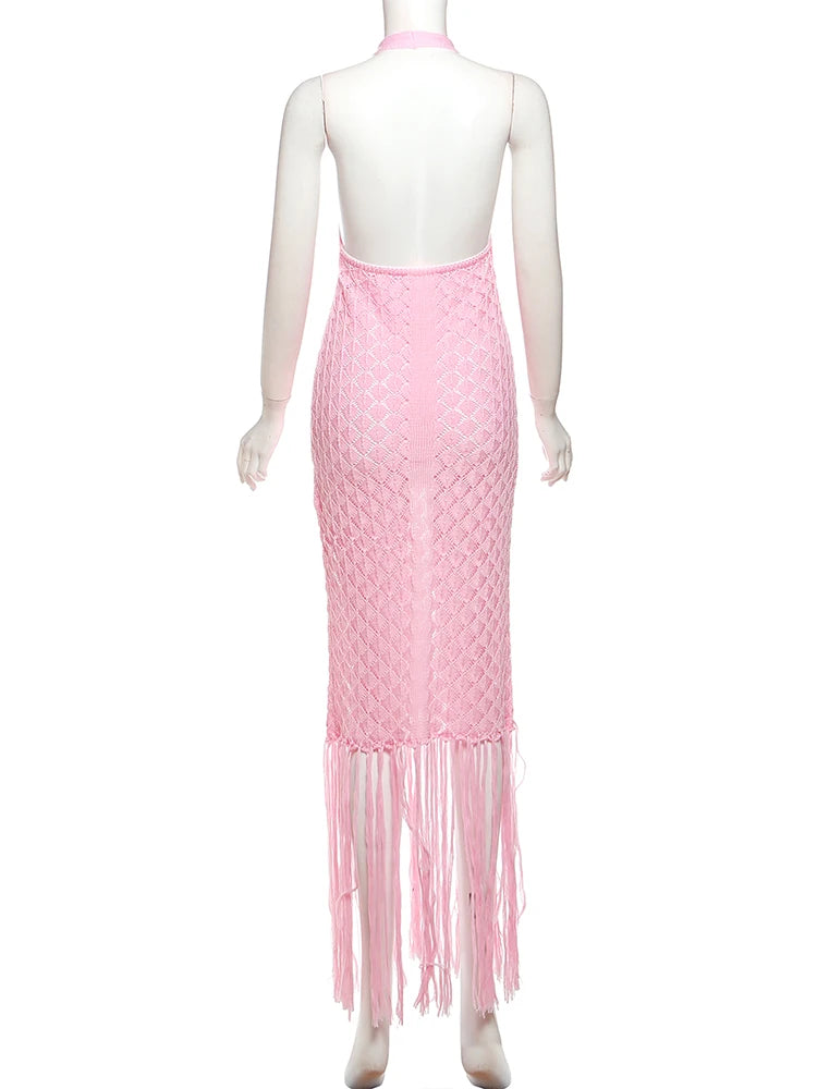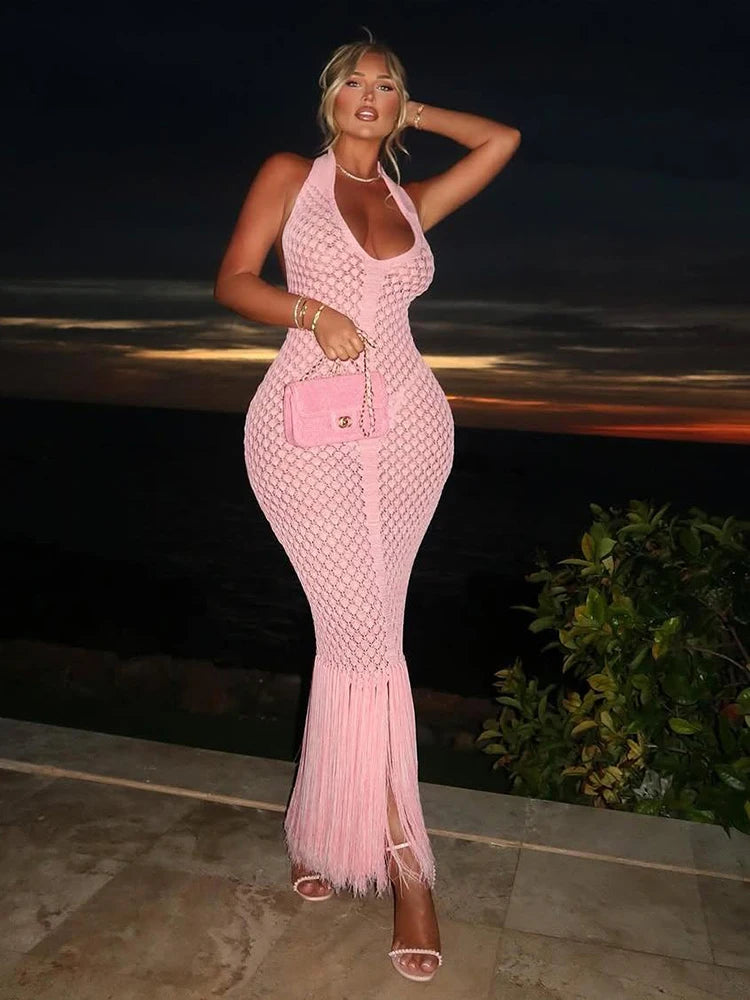 Wired Puss Backless Halter Dress Women Sexy Summer Deep V-Neck Hollow Tassel Solid Patchwork Slim Midnight Party Club Vestidos