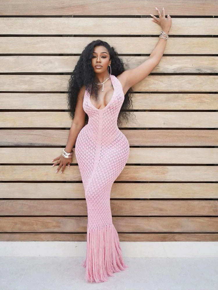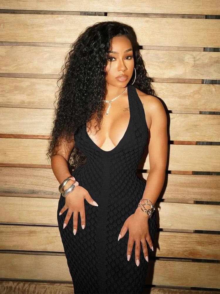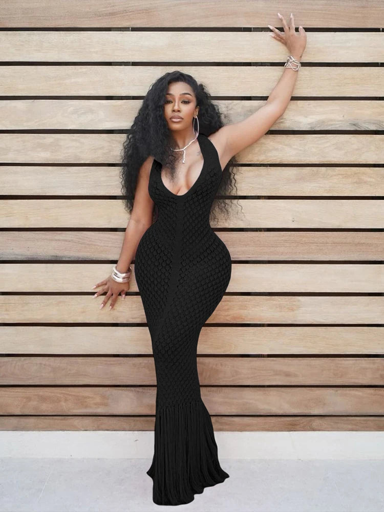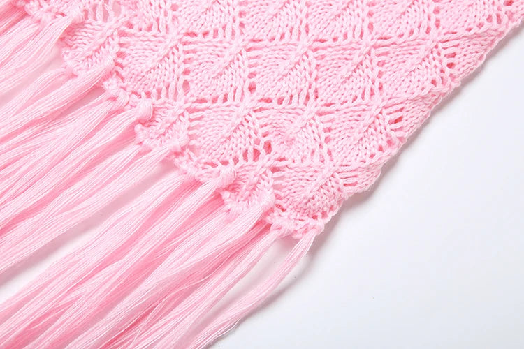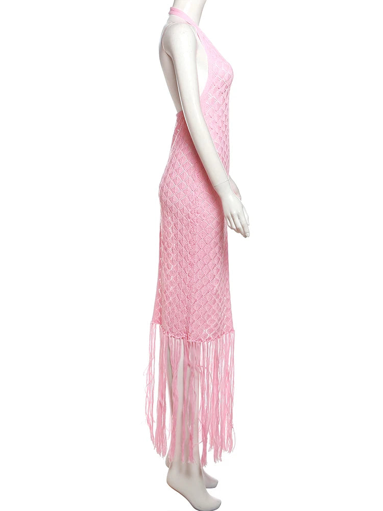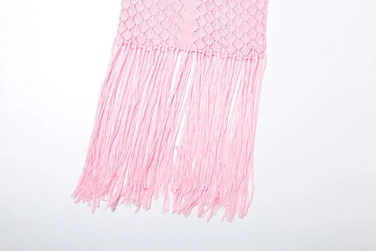 Wired Puss Backless Halter Dress Women Sexy Summer Deep V-Neck Hollow Tassel Solid Patchwork Slim Midnight Party Club Vestidos