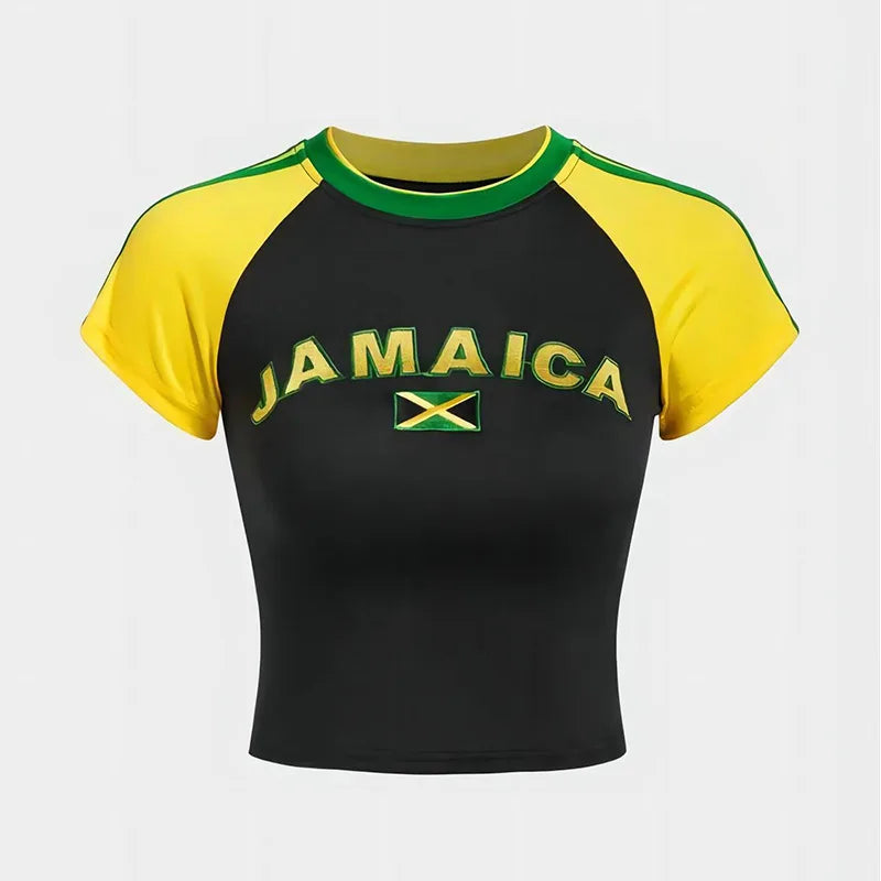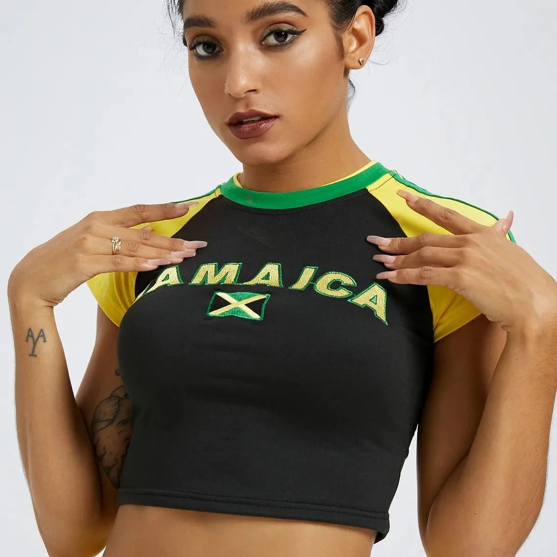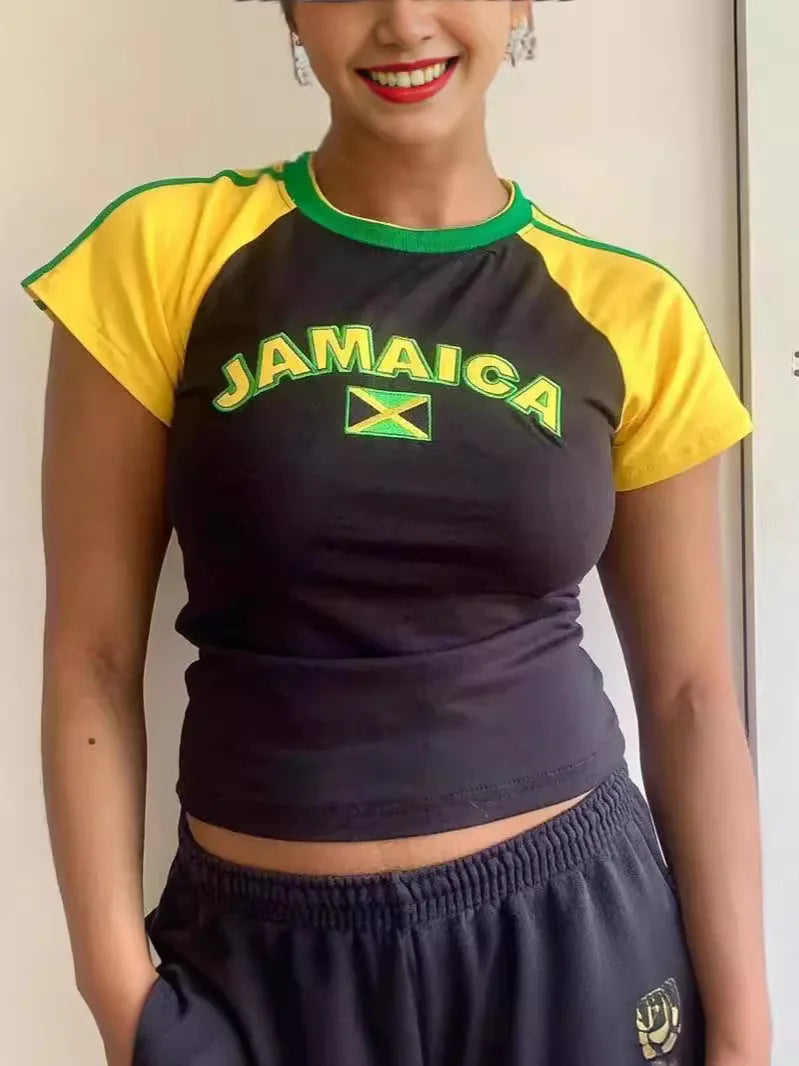 Women Aesthetic Jamaica Letter Print T-shirt Vintage Grunge Short Sleeve Baby Tees 2000s Summer Sexy Crop Tops Gothic Y2k Clothe