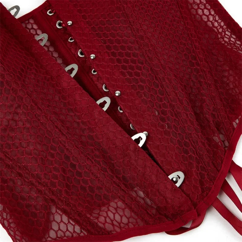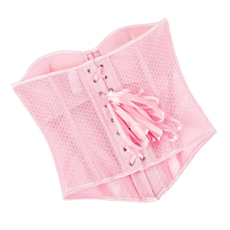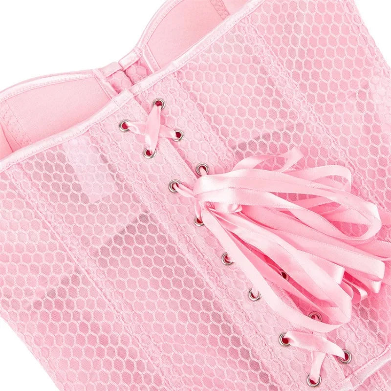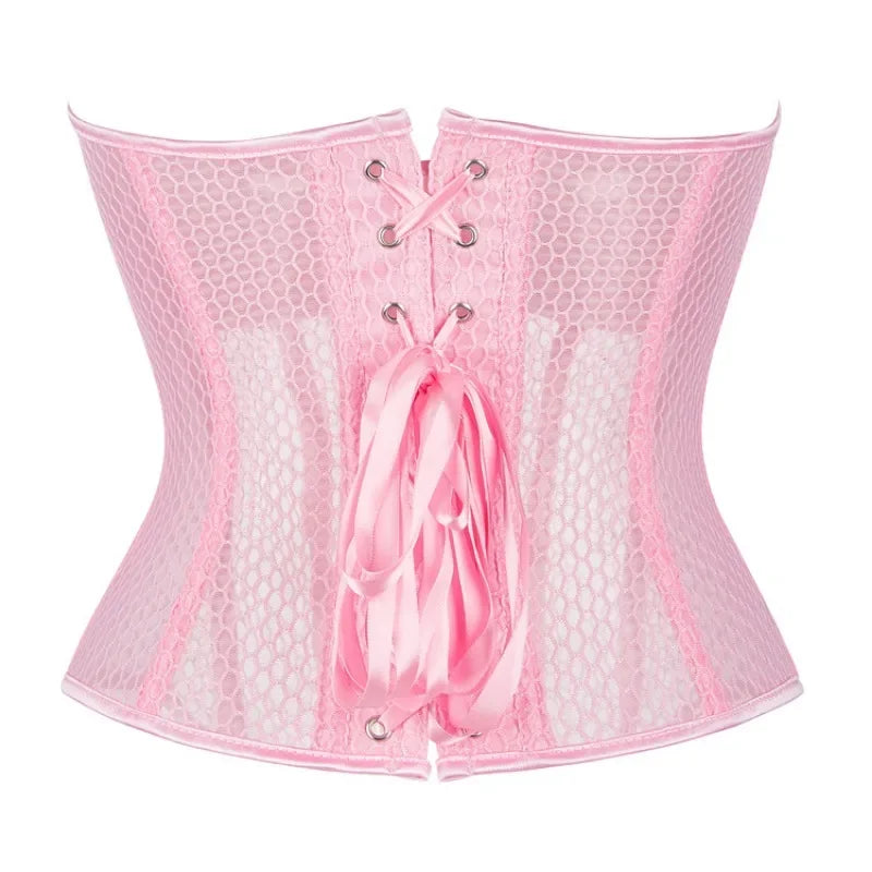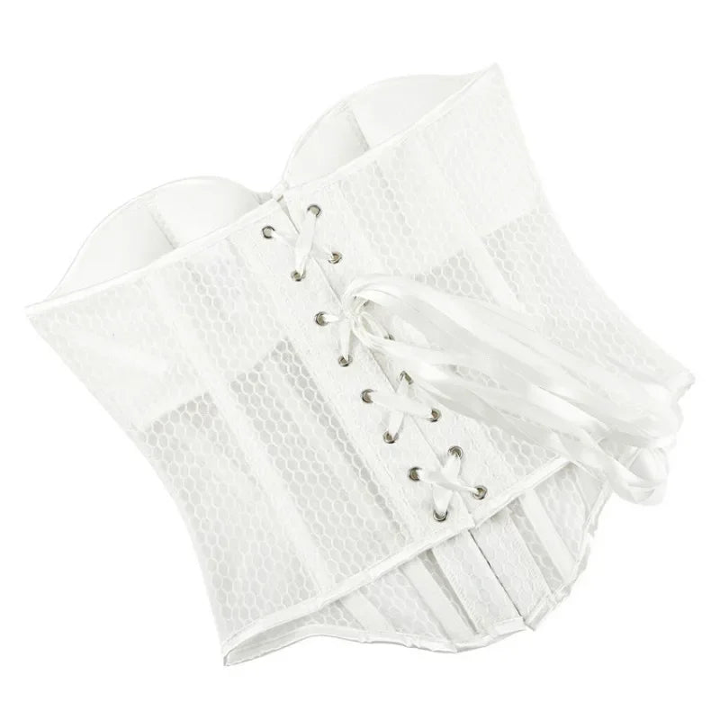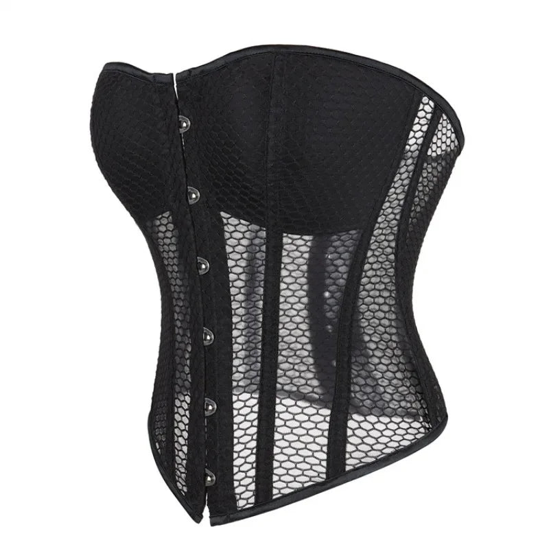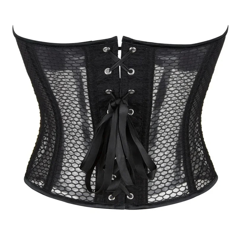 Women Lace Up Sexy Transparent Mesh Boned Corset Overbust Bustier Lingerie Bodyshaper Top Corsets Top