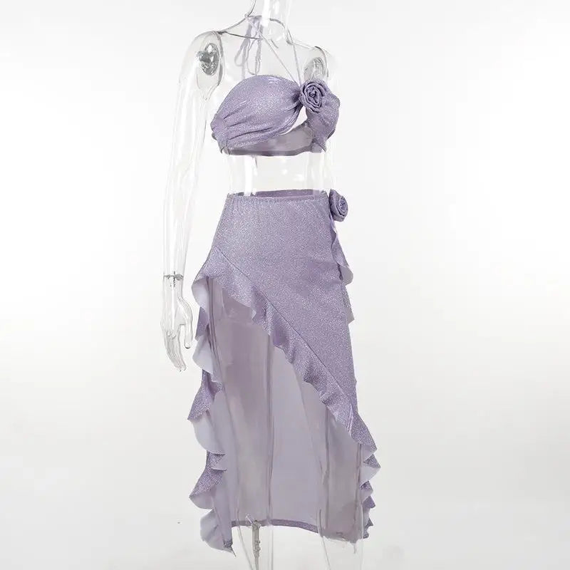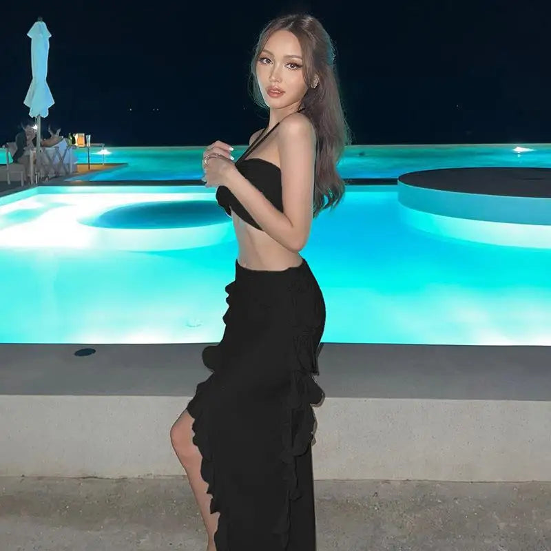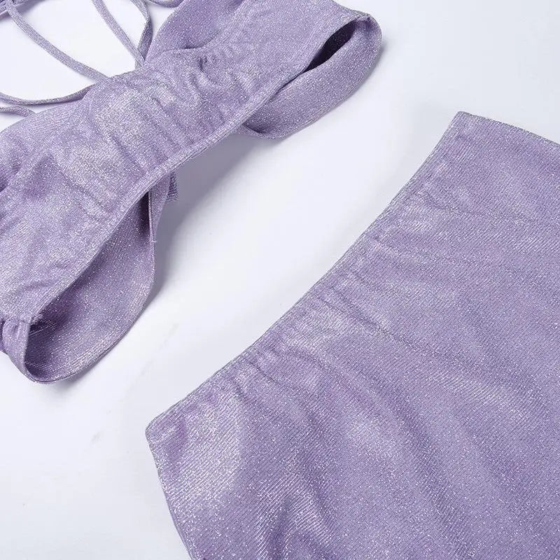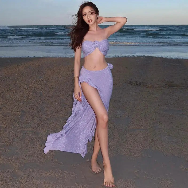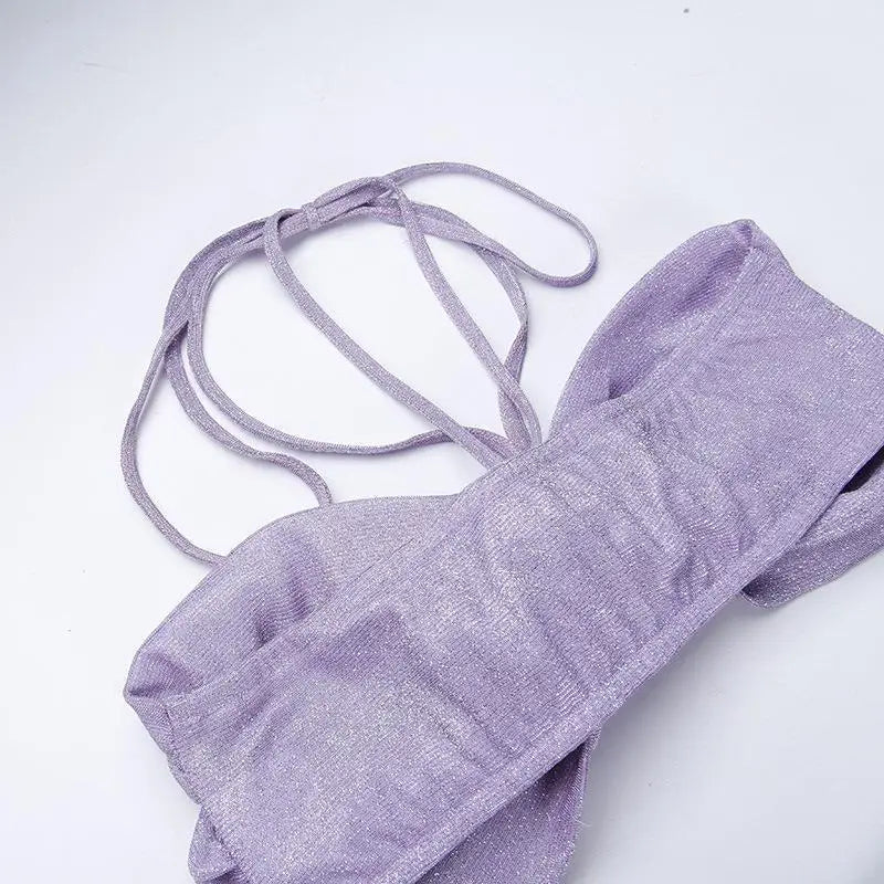 Women Sparkling 3 Piece Swimsuit Halter Neck Sexy Bathing Suit Hot Spring Ready Body Shaping Photogenic Swimwear Vacation Dress