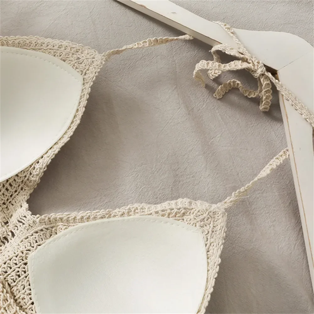 New Sexy Y2K Streetwear Knitted Backless Crop Tops Women Hollow Out Crochet Tassels Hem Halter with Bras