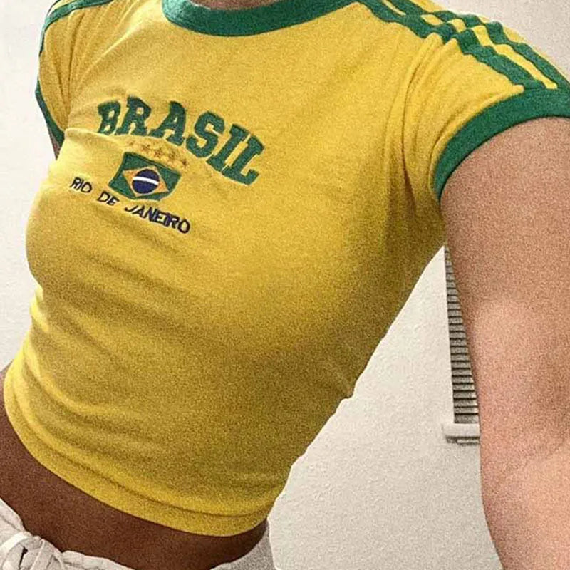 Aesthetic BRASIL Letter Print T-Shirt and Shorts Suit, Vintage Grunge Short Sleeve Baby Tees, Summer Crop Top Y2k Clothe