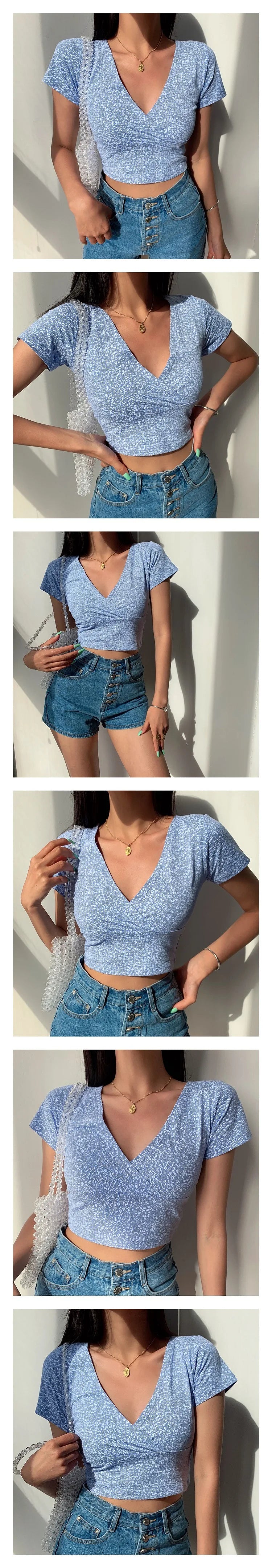 Y2K Vintage Floral Cross Crop Top T-shirt Women Cropped Slim Short Sleeve V-neck Sexy Summer Clothes Tee Shirt Femme Woman Tops