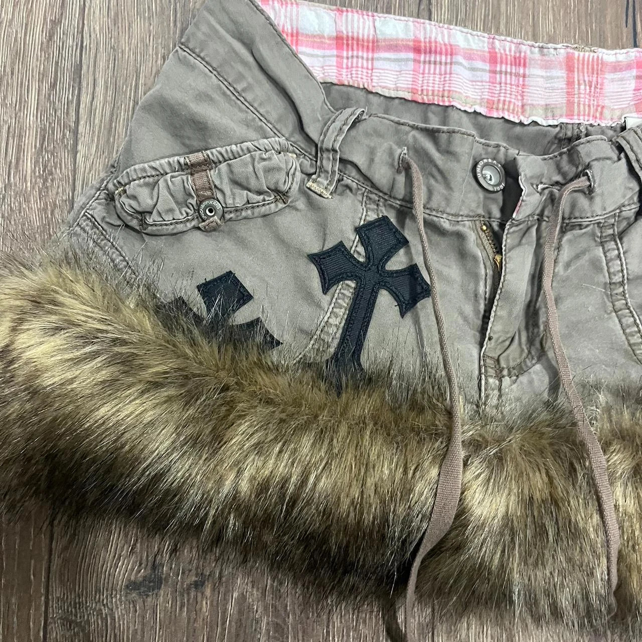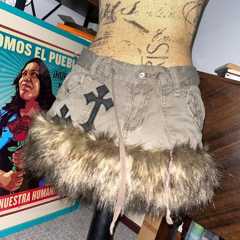 Y2K Vintage Khaki Raw Edge Cargo Skirt Harajuku Hottie Low Waist Mini Skirt Gothic Casual Cross Graphic Embroidery Short Skirt